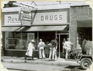 a lrage picture in the stoe window as an advertisement for Rexall Cod Liver